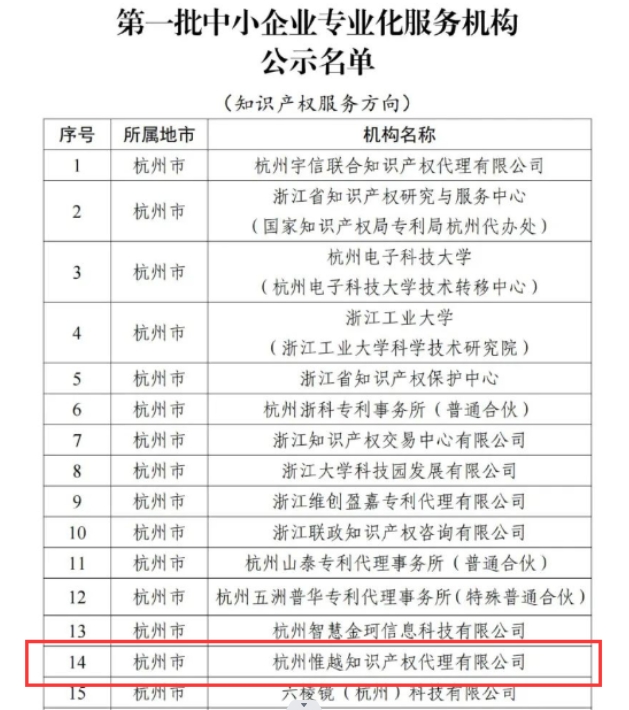 喜報(bào)!!關(guān)于杭州惟越知識(shí)產(chǎn)權(quán)代理有限公司入選浙江省首批中小企業(yè)專業(yè)化服務(wù)機(jī)構(gòu)的公示
